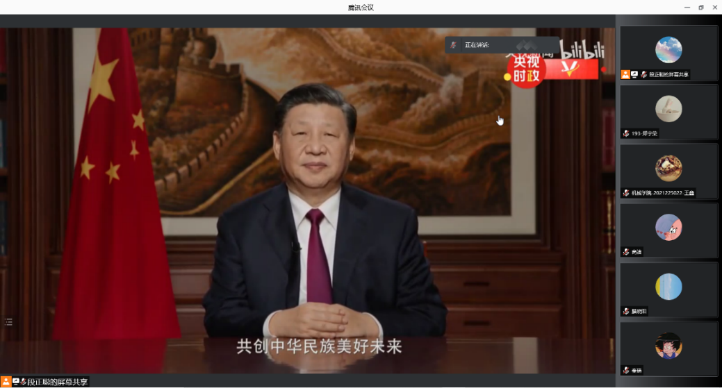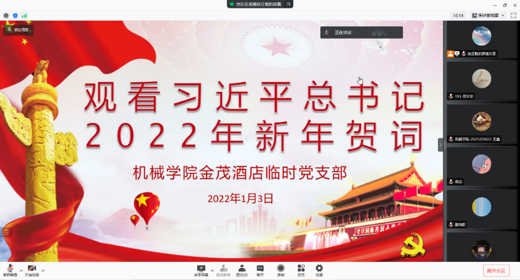 2022年1月3日,机械学院金茂酒店研究生临时党支部组织线上观看习近平总书记二0二二年新年贺词,此次支部活动由临时党支部书记段正聪主持,临时党支部全体党员参加。