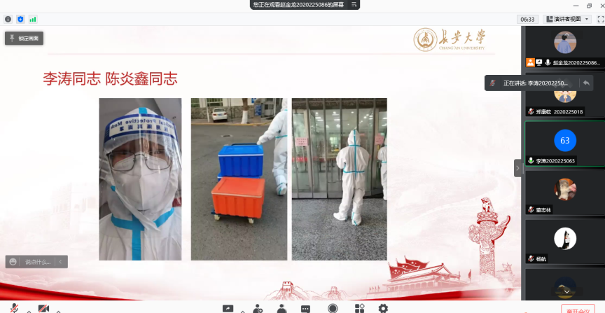 李涛和陈炎鑫同志分别就承担疫情防控过程中志愿活动的心得体会进行发言。李涛同志谈到自己充当抗疫志愿者的初心,认为作为党员就应当冲锋在前、敢为人先。陈炎鑫同志号召全体党员积极投身到抗疫志愿活动中来,共同承担抗疫责任。
