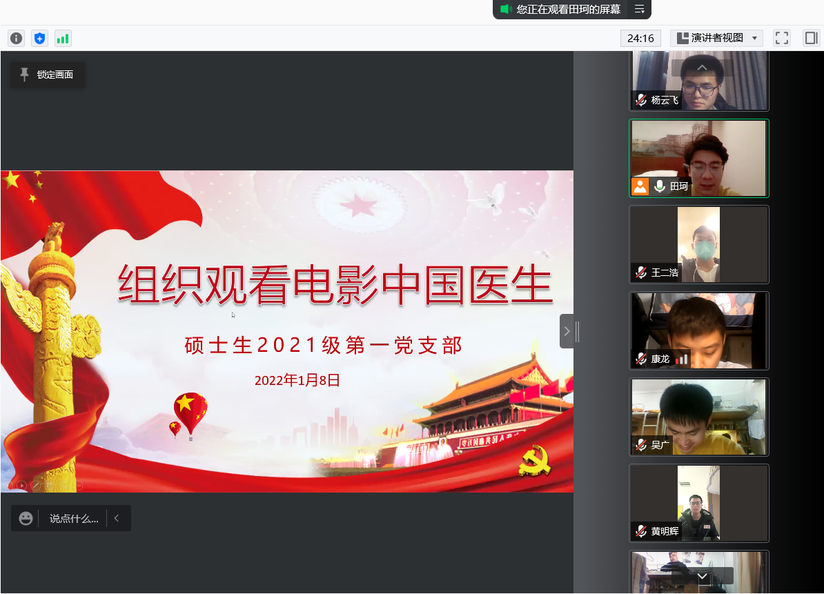为了弘扬抗疫精神,激发党员同志们的责任感与使命感,2022年1月8日晚18:00,澳门太阳城唯一正版授权网站 硕士生2021级第一党支部组织支部成员线上观看电影《中国医生》,此次会议由支部书记田珂同志主持。
