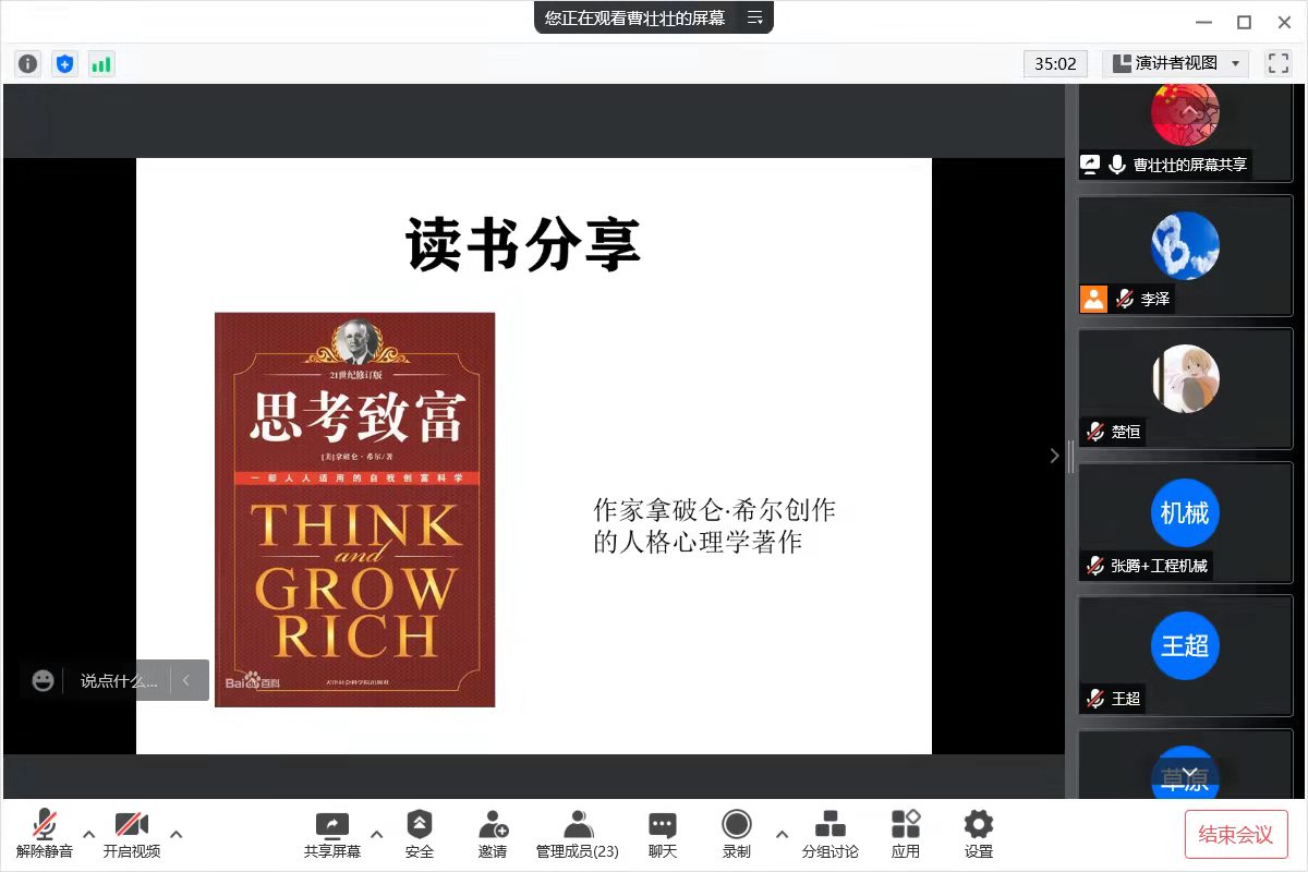 会议上,曹壮壮同志分享了拿破仑·希尔创作的人格心理学著作《思考致富》。这是一本教人实现经济独立与思想富有的励志书籍,揭示部分成功人士致富的秘诀。每一个人的内心都蕴藏着巨大的潜能,如果支撑的是健康向上的正能量:信心、意志、梦想、意念,知道自己想要什么,并矢志不愈,梦想就会成真。这个秘诀对于准备接受它的人来说,效力均等,与受教育程度无关。