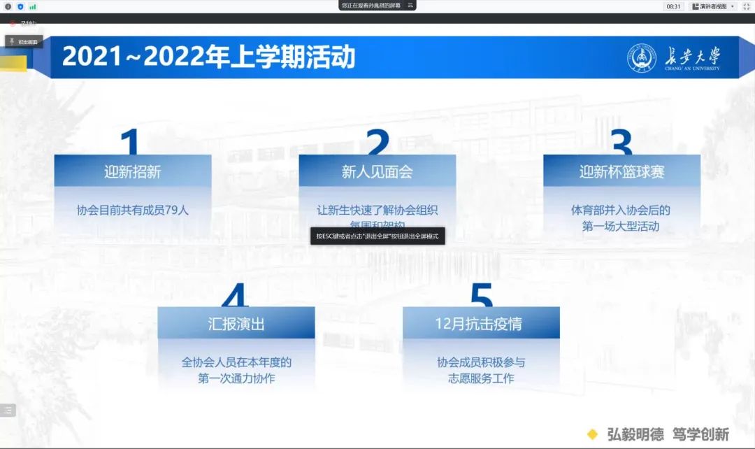 2022年3月21日晚19时,澳门太阳城官网 文化艺术与体育协会2021年秋季学期述职报告以线上腾讯会议的形式如期举行,本次会议由语言部陈一凡主持,参加会议的有院文体协会指导教师杨文佳,主席团成员孙胤祺、徐默、李泽坤、罗晨豪、张清僖,各部门部长与部员。
