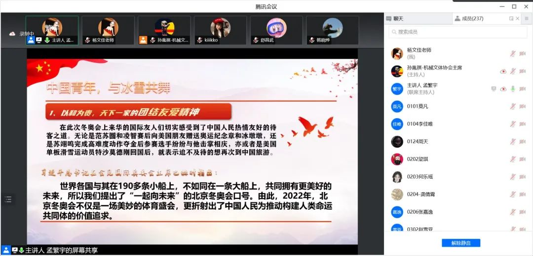 2022年3月25日晚19时,澳门太阳城官网 文化艺术与体育协会以线上腾讯会议的形式成功举办“聚焦冬奥,与冰雪共舞”线上专题学习活动。本次专题学习活动由文体协会语言部孟繁宇同学主讲,参加会议的有院文体协会指导教师杨文佳,文体协会全体成员及通过青春长大报名的237名同学。