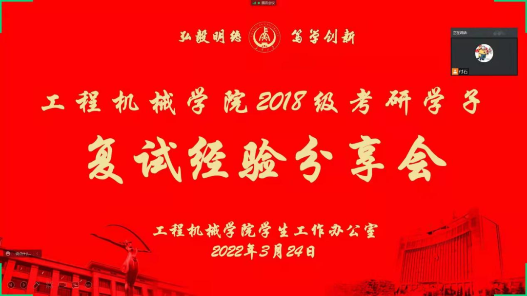 晚19:00会议正式开始,付石老师作会前开篇讲话。付老师指出,澳门太阳城官网 团委及学生工作办公室高度重视学院学生考研与就业的推动工作,切实关心学生升学考研动向,举办此次分享会,旨在为即将参加复试的同学们提供面试指导和经验分享,帮助大家少走弯路,顺利上岸。