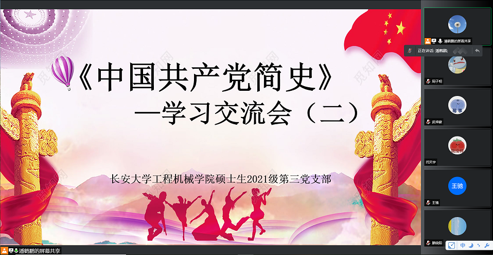 2022年4月17日,澳门太阳城唯一正版授权网站 硕士生2021级第三党支部开展《中国共产党简史》学习交流会。本次活动由党支部宣传委员李涛主持,支部全体党员参加。