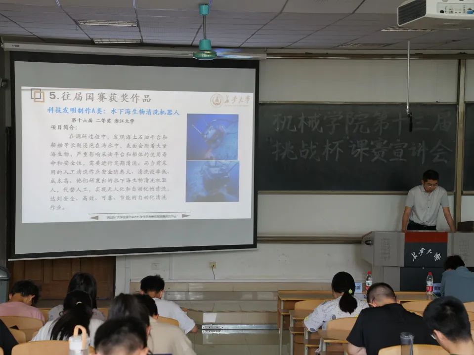 接着,朱雅光教授向同学们介绍本届“挑战杯”比赛。朱雅光教授从挑战杯赛事简介、参赛要求、参赛建议、作品撰写、参赛中应该注意的问题及往届国赛获奖作品六个方面为大家进行讲解。朱雅光教授提出竞赛的宗旨:崇尚科学,追求真知,勤奋学习,锐意创新,迎接挑战。竞赛的目的为培养学生创新精神和实践能力。同时,朱教授为大家讲解了具体参赛要求:以创新为灵魂,以助力经济发展为目标,以科学性为原则,以竞赛规则为红线,朱雅光教授强调,提出一个好题目能够在比赛中更加亮眼。