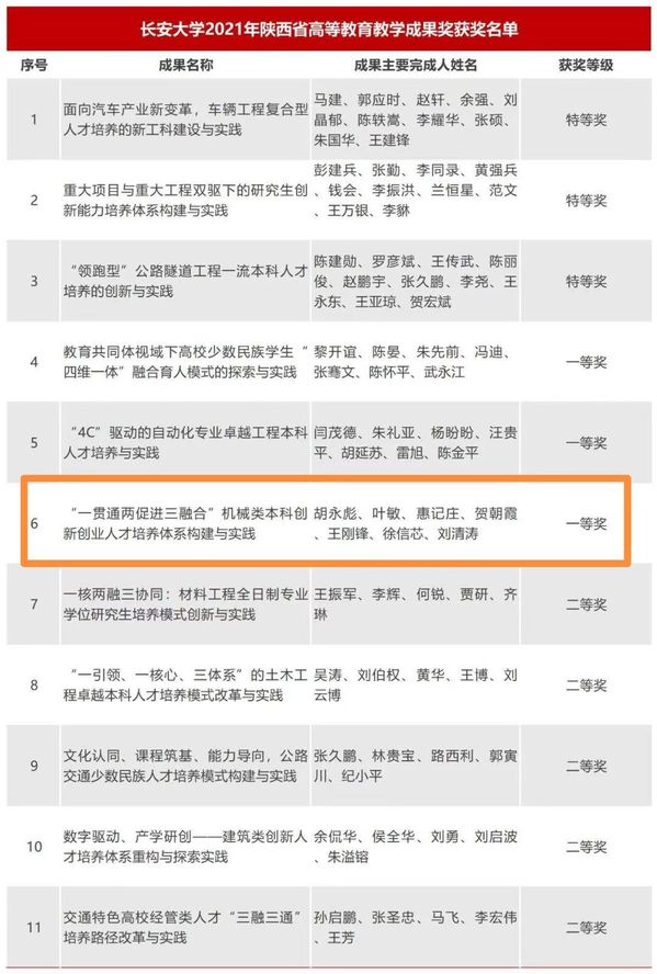 另外,据中国交通教育研究会发布的《2019至2021年度交通教育科学研究优秀成果奖拟获奖名单公示》,澳门太阳城唯一正版授权网站 惠记庄教授、叶敏教授领衔申报的《新工科背景下公路交通智能装备卓越人才培养模式创新与实践》荣获中国交通教育研究会优秀成果奖一等奖。
