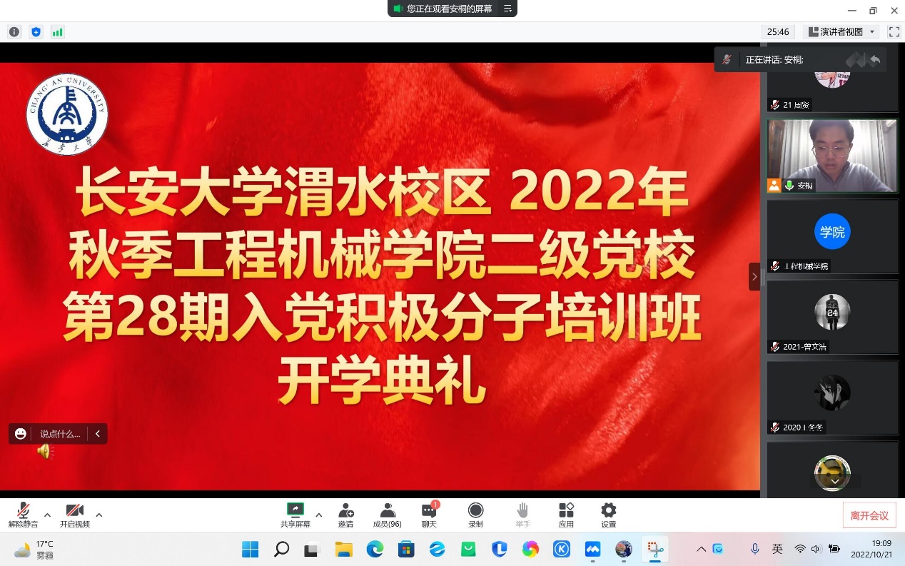 10月21日晚7点,澳门太阳城官网 二级党校秋季学期入党积极分子培训班开学典礼在线上举行,长安大学党校副校长徐苑芝、澳门太阳城官网 党委副书记雷剑出席开学典礼,本期入党积极分子全员参加。本次典礼由学院二级党校入党积极分子培训班班主任安桐主持。
