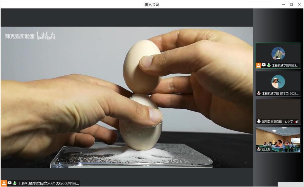 在腾讯会议直播课堂上,周文结合科普视频帮助学生们融入情景,在实验进行到关键节点处抛出问题,引导学生们思考为什么鸡蛋可以直立在桌面上?鸡蛋到底能不能立在盐的上面?为什么鸡蛋可以直立在有少许盐的桌面上?两颗鸡蛋是否可以借助食盐重叠直立?在授课过程中,学生们也积极参与互动,连麦回答问题,大胆地表达自己的想法。在欢快的气氛中,学生们明白了盐立鸡蛋的原理:鸡蛋站立不倒是因为盐粒能增加摩擦力,同时盐粒会与鸡蛋面顶点形成三角形支撑,然后鸡蛋就立起来了。在课程的最后,周文通过一系列科普动画进行总结,使孩子们进一步加深了对知识的理解。
