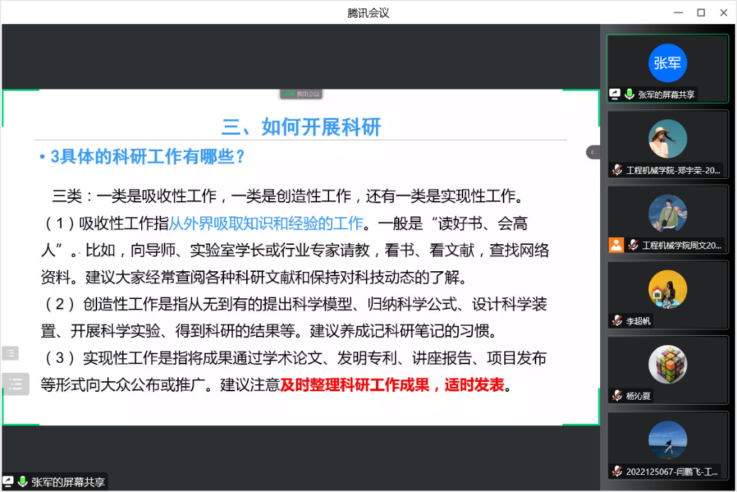 在会议上,张军先进行了简单的自我介绍。随后,通过分析研究生与本科生的差别,他指出研究生在与导师交流时,应适当从导师更加关注结果的角度去思考和表达,这样会非常有利于师生的学术交流。接着,张军分别从科研的实质、科研的方向、具体的科研工作、研究生应具备的科研素质以及如何看待科研工作中的成败五个方面详细地阐述了研究生该如何开展科研生活。