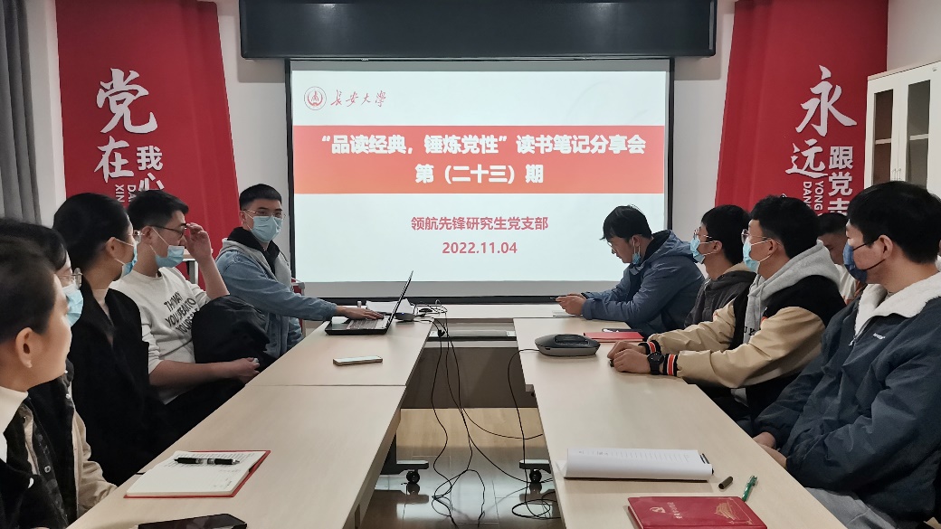 2022年11月4日,澳门太阳城唯一正版授权网站 领航先锋研究生党支部组织支部成员在澳门太阳城官网 221会议室开展了第二十三期读书笔记分享活动,本次活动由支部成员于通做读书笔记分享。支部全体党员参加了此次活动。