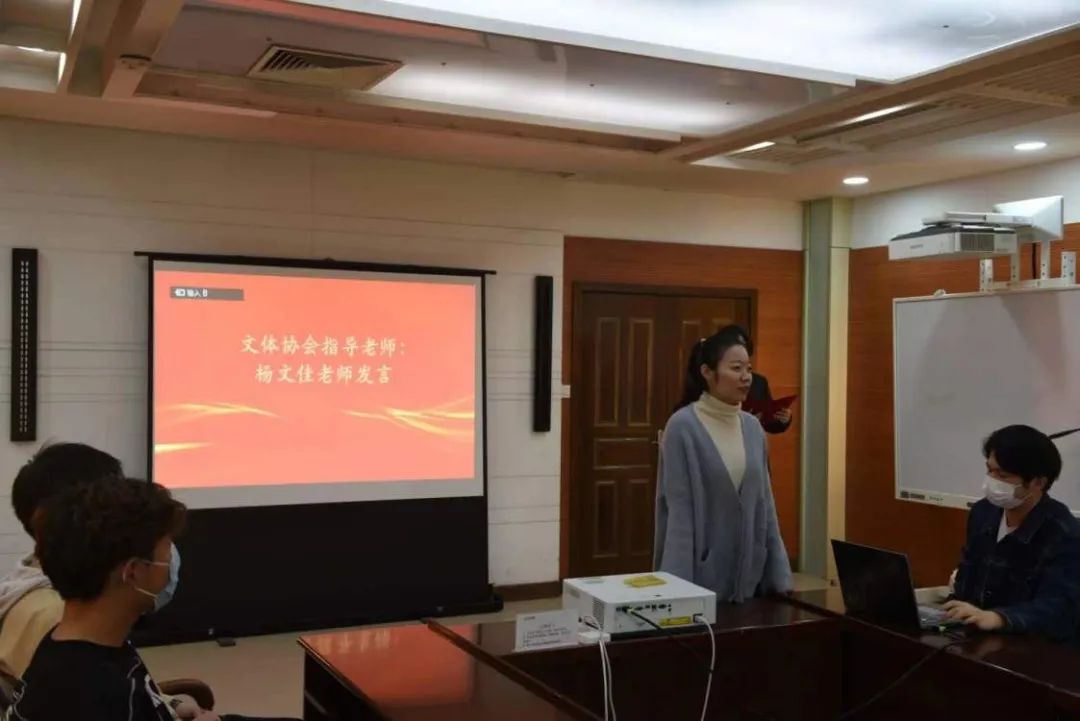 首先,澳门太阳城官网 文体协会指导教师杨文佳对文体协会的新成员表示热烈欢迎。 首先,杨老师要求新加入的成员能尽快熟悉协会工作,在新学期共同为文体协会的建设添砖加瓦;随后介绍了文体协会概况并对本学期文体协会的各项重点工作进行总体部署安排;最后,杨老师希望同学们在文体协会能够发挥主观能动性,积极建言献策,多倾听、多总结,将个人融入集体,同心协力,踔厉奋发,在集体中闪耀自己的光芒!