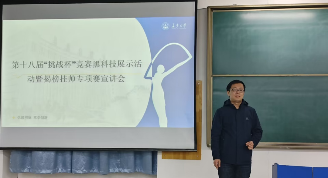 2023年3月16日晚上19点,第十八届“挑战杯”竞赛“黑科技”展示活动暨“揭榜挂帅”专项赛宣讲会于鸿远教学楼WH1103圆满举行,本次宣讲会由机械科协指导教师夏晓华老师担任主讲人。