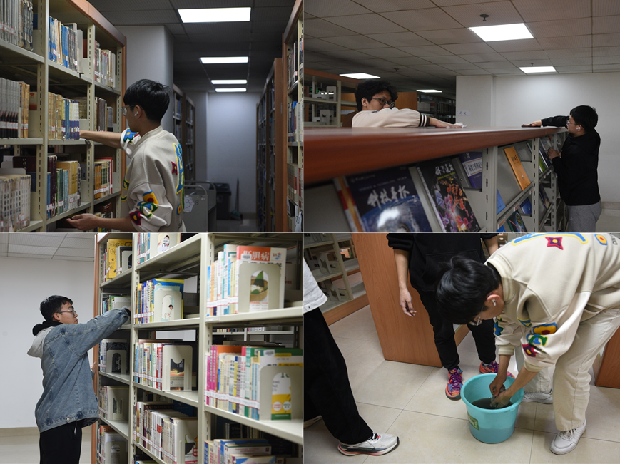 活动开始前,团支部书记和班委对班级成员进行小组分工,划分区域进行清理。对图书馆书架区域进行灰尘擦拭,将图书整理后放到指定书架。活动过程中,全体志愿者不畏辛苦,不惧脏污。经过2个小时的整理劳动,图书馆借阅区书架变得焕然一新。