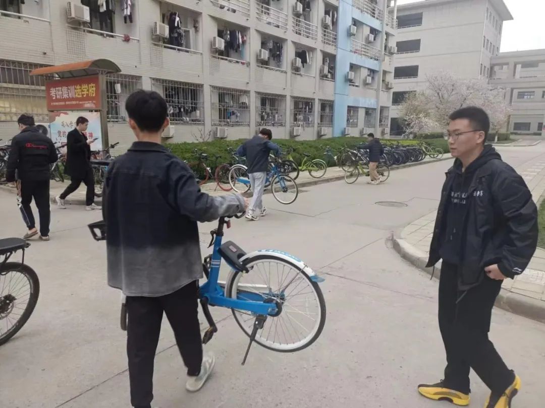 活动前期,由相关负责人在“青春长大”平台发布活动信息,同学们自愿报名,共招募12位志愿者。本次活动主要在1号楼、4号楼、6号楼学生公寓楼下进行,活动开始,志愿者于各自负责的区域集合,由带队负责人讲述了此次活动的目的以及自行车摆放过程中的注意事项,随后志愿者们自由组队,将共享单车集中摆放,为便于寻找,同学们的自行车则按照就近原则进行摆放。在摆放期间,志愿者还对共享自行车车筐内的广告宣传单及垃圾进行了清理。