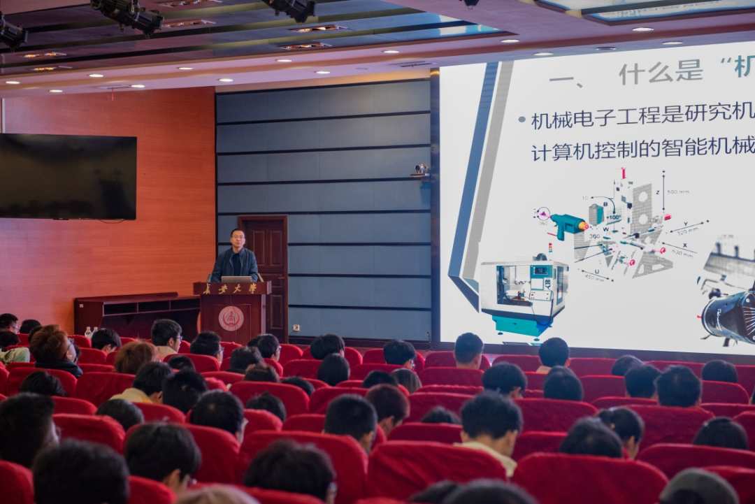 曹学鹏以“机电融合,智启未来”为题,从什么是机械电子工程、专业培养目标、机械电子工程专业介绍三个方面进行讲述。曹老师指出,机械电子工程专业作为国家级特色专业,是工程机械领域发展最快、最活跃的专业之一,它以培养高素质工程技术人才为目标,旨在把学生培养成为“基础实、口径宽、能力强、素质高”的富有创新精神和实践能力综合性高素质人才。最后,曹老师从就业前景与学生深造率等数据进行分析,介绍了机械电子工程专业毕业生去向与升学情况,进一步增强了学生的专业学习信心。