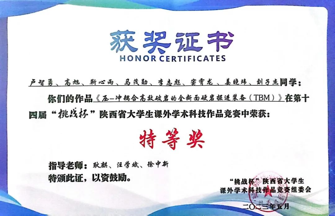 机械学院积极响应团省委和校团委号召,广泛组织学生参与本届“挑战杯”竞赛。由耿麒、汪学斌、徐中新老师指导的《压-冲耦合高效破岩的全断面硬岩掘进装备(TBM)》作品荣获省级特等奖,实现了学院在该项赛事的新突破。团队成员包括卢智勇、高旭、靳心雨、马茂勋、李志彪、窦霄龙、姜晓玮、刘子杰共8名同学。