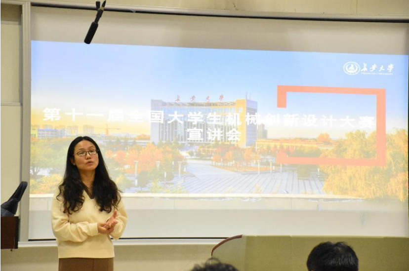 晚7时整,宣讲会准时开始,首先由贺朝霞致辞,她从比赛意义和对大学生的能力培养两方面讲述了机创赛的重要性,鼓励同学们积极参加比赛并预祝同学们在比赛中取得好成绩。