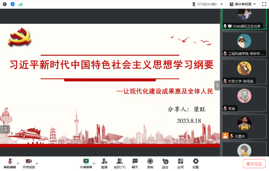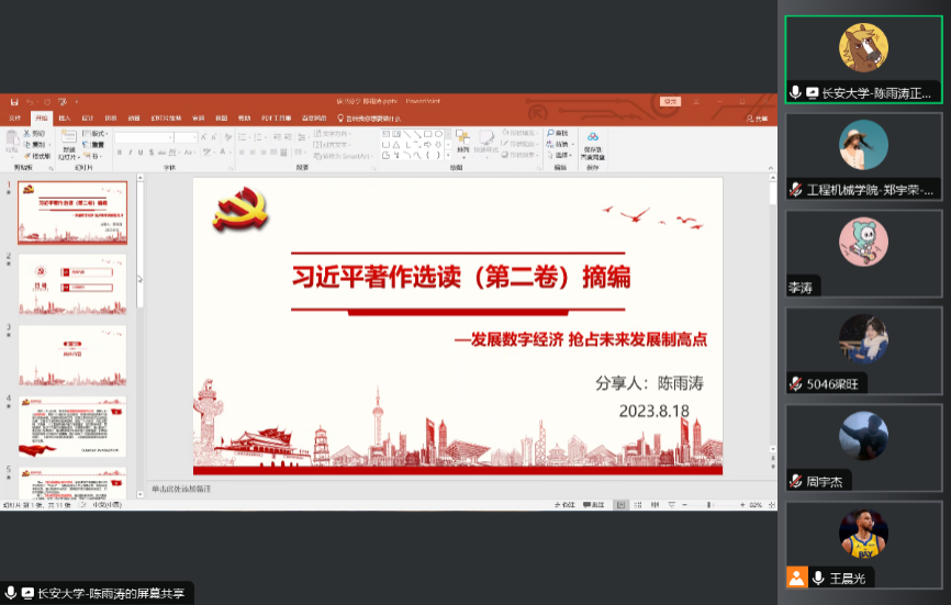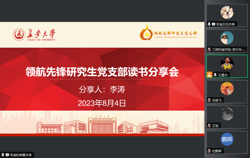 按照学校暑期主题教育学习不间断的工作安排和总要求,澳门太阳城官网 领航先锋研究生党支部在暑期继续保持理论学习不断线,坚持开展两周一次的线上读书分享活动。