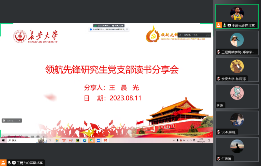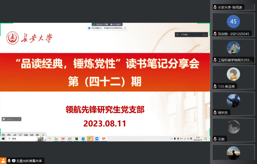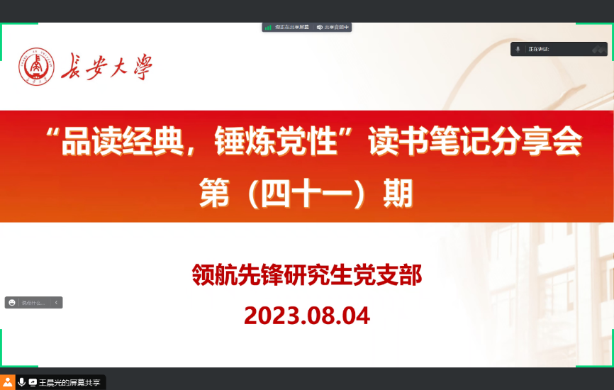 2023年8月11日,澳门太阳城官网 领航先锋研究生党支部组织支部成员线上开展了第四十二期“品读经典,锤炼党性”读书分享活动,本次读书分享活动对照支部主题教育学习安排,由支部成员王晨光、柴玉琳领学。