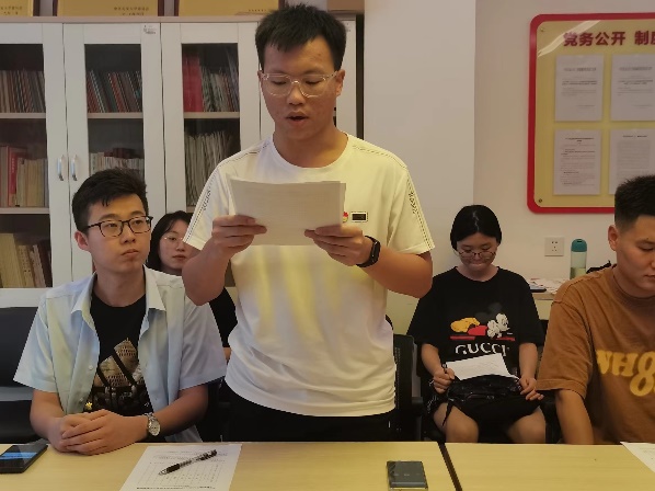 会议第一项,党支部新进党员进行自我介绍。此次党支部新进党员7名,涵盖硕士研究生和博士研究生各年级段。在自我介绍后,党支部全体成员对支部新鲜血液表示了热烈的欢迎,期待在大家的共同努力下,党支部能够迸发出新的活力。