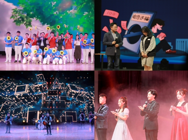 晚会节目异彩纷呈,气氛热烈,处处洋溢着青春活力。在学院冬夏启动器乐队动感地音乐中晚会拉开帷幕;歌伴舞《第一天》、《一路生花》、《奔跑的青春》悠扬的歌声、动感的舞步展现了学子们奔向未来的青春姿态;小品《环环相扣》寓教于乐,宣传防范电信网络诈骗知识;合唱《夜空中最亮的星》鼓励同学们勇敢追逐心中的梦想;优美的民俗舞《剪花娘子》展现着中华传统民间文化的绚烂多姿;朗诵《奉献的青春》师生共同演绎投身志愿服务的青年力量,将晚会气氛推向高潮;最后,晚会在大合唱《仰望星空》中落下帷幕。