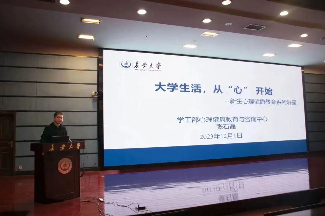 为了掌握同学们的心理健康状态,帮助同学们解决心理困惑,2023年12月1日下午,澳门太阳城唯一正版授权网站 2023级新生教育工程讲座第十讲于北辰楼会议中心二层报告厅召开。本次讲座主题为“大学生活,从心开始”,长安大学学工部心理健康教育与咨询中心副主任张石磊老师主讲,2023级辅导员安桐、王风珊及2023级全体新生参加,会议由2023级辅导员左意老师主持。
