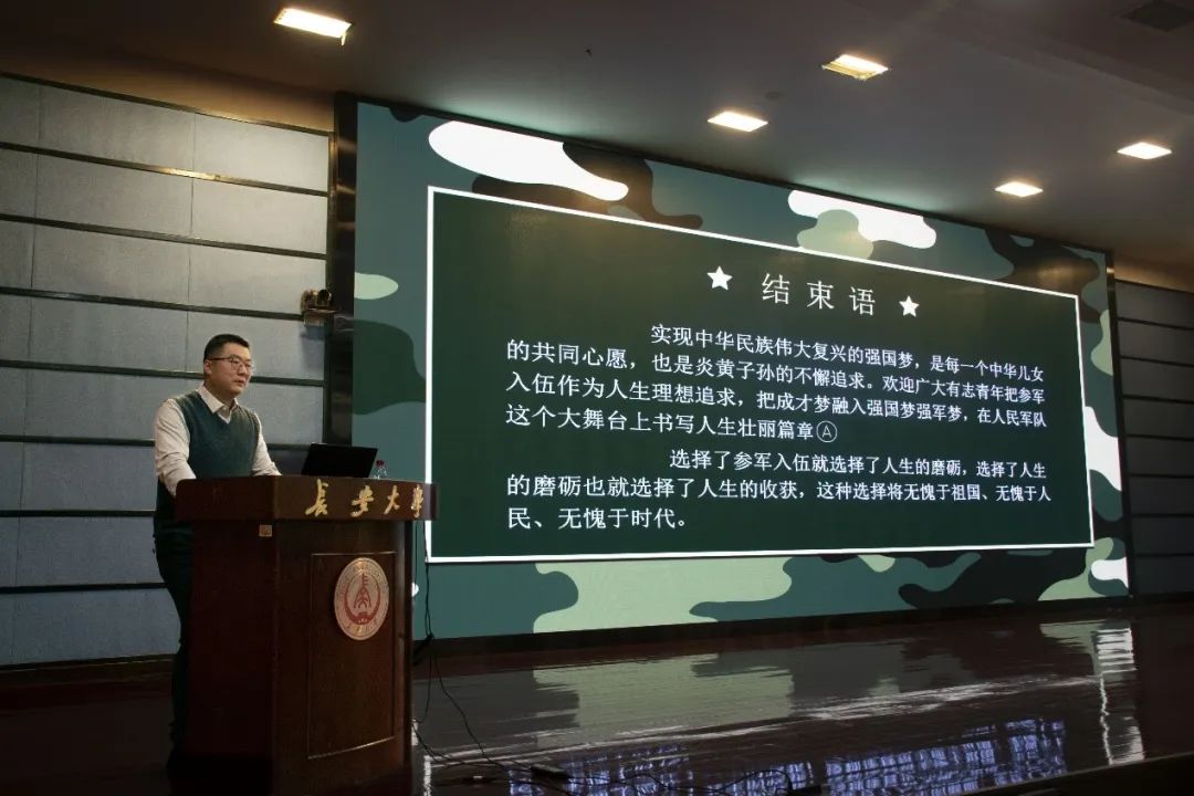 倪老师从大学生参军入伍的政策入手,介绍了一系列有关经济补助、评奖评优、保研加分等政策优势,让同学们对于大学生参军入伍的优待政策有了更全面的了解。随后,倪老师从报名流程、政治审查、体检等方面向同学们介绍了应征入伍的要求。最后,倪老师对2023级新生寄予期望,希望符合条件的新生踊跃报名应征入伍。