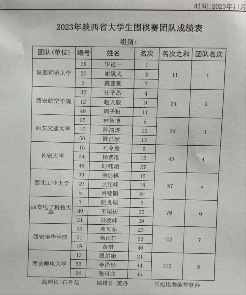 2023年11月25日-26日,长安大学代表队在2023年陕西省大学生围棋赛中取得团队第四名和优秀组织奖。