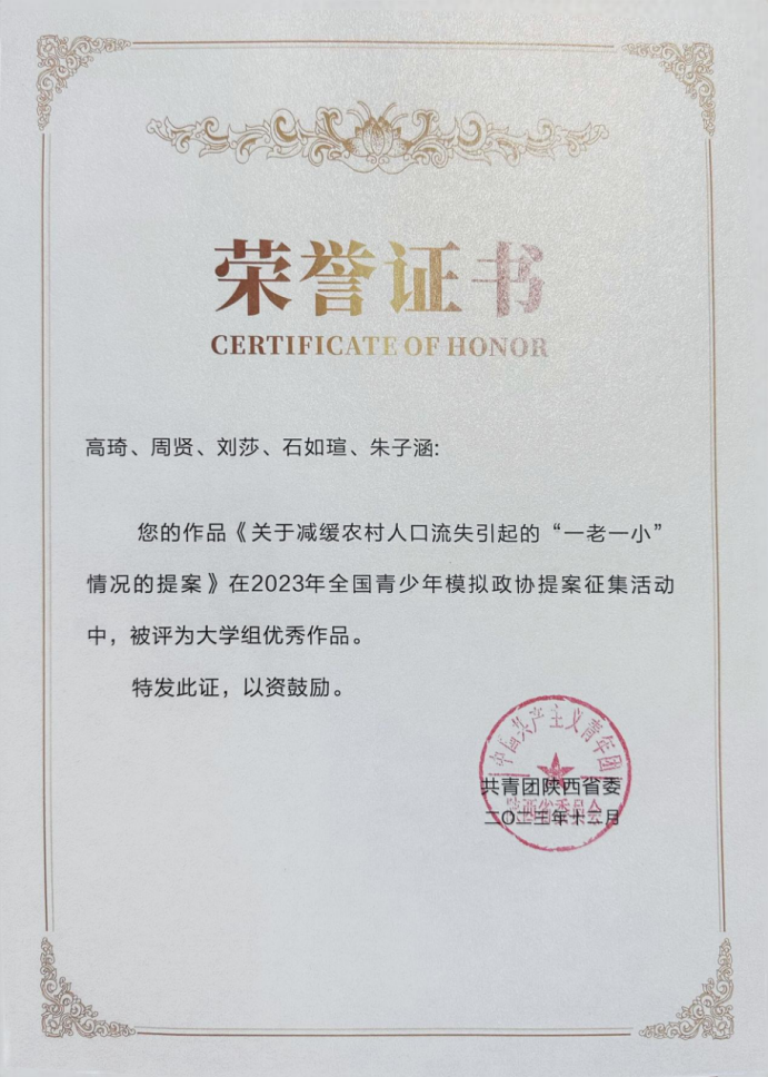 近日,由共青团陕西省委主办的2023年全省青少年模拟政协提案征集活动评审结果出炉,由澳门太阳城唯一正版授权网站 卢泓旭、吴德林老师指导,高琦、周贤等同学完成的提案《关于减缓农村人口流失引起的“一老一小”情况的提案》获得大学组优秀作品奖。