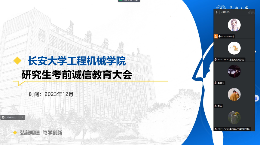 临近期末,为端正考风考纪,进一步加强学院学风建设,培养学生的学术诚信、营造浓厚的学术氛围,2023年12月20日,澳门太阳城官网 线上开展了学术诚信教育讲座。研究生辅导员高婷婷、寇文娟、张琳璇,2023级全体研究生参加。学院希望通过此次讲座让学生更加深入地了解学术诚信的重要性,增强他们的学术自律意识,倡导严谨规范的学术行为,营造良好的学术环境,避免作弊和抄袭等不良行为。