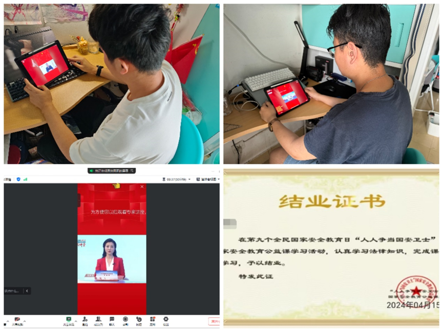 收看“人人争当国安卫士” 国家安全教育公益课。4月10日起,学院组织全体学生通过“快手极速版”平台观看国家安全教育公益课,学习总体国家安全观、国家安全法、反间谍法、保守国家秘密法、反分裂国家法、反恐怖主义法、网络安全法、生物安全法、数据安全法、香港特别行政区维护国家安全法等相关内容,各年级及时统计学生学习情况,确保每位同学认真完成,凡连续学习8天,可获得《全民国家安全教育结业证书》。