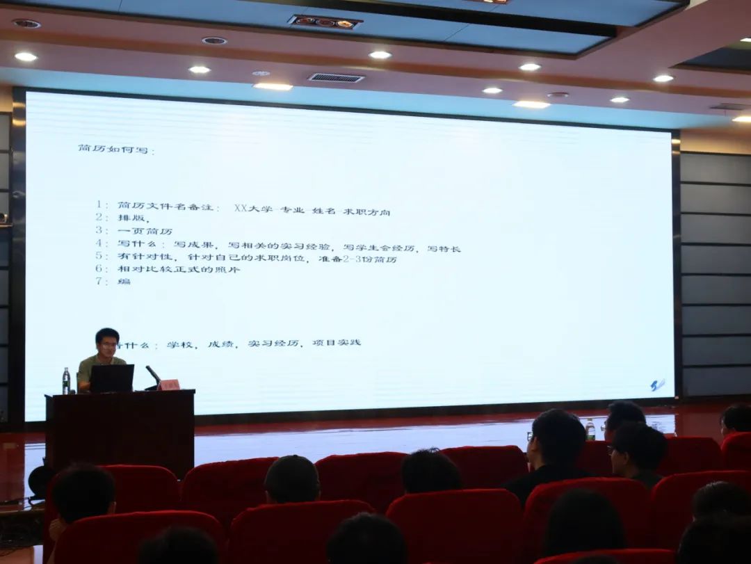 主讲嘉宾元海刚老师向全体学生作“职引未来·生涯筑梦”就业指导专题教育讲座。他结合自身丰富的工作经历,从自我认知、职业选择、求职技巧、思考总结四部分出发,为大家带来了一场生动形象、内容丰富、指导性强的专题讲座。