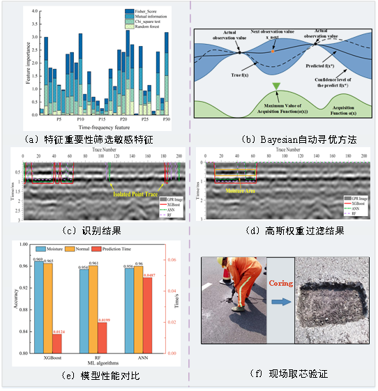 提出了反映水损害的时频域特征,将多源数据集分别归一化后再合成为最终数据集,增强了识别模型的泛化能力。为了提高模型速度及精度,提出组合识别策略,包括特征重要性方法选择最敏感特征,贝叶斯超参数优化后的XGBoost模型,以及高斯权重和尺寸连续的孤立结果过滤法,提高了水损害的识别精度,如下图。