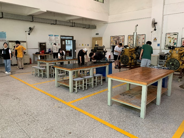 接下来,指导老师结合工程机械专业特色,带领学生们开展了工程车辆发动机与底盘构造的原理认知、结构拆装与参数调试的内容学习。学生们在学习专业知识的过程中,需要对机械结构件进行了解、拆卸、安装与调试操作,生产实习过程中需要学生们分工合作,相互配合。通过该环节的学习,培养学生安全劳动的好习惯,在劳动中学会与他人合作。