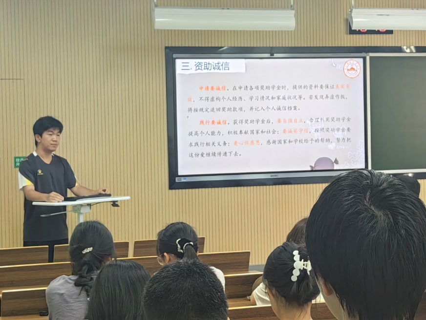 班会伊始,左意老师表示本次班会的召开,有利于帮助同学们了解学校的各种奖助政策,树立大学期间的奋斗目标,推进两班文明班集体建设工作有效展开。随后左老师深入细致地介绍了国家奖学金、国家励志奖学金、国家助学金以及澳门太阳城唯一正版授权网站 各类社会奖助学金相关的资助政策、资助类型和评选方式,涉及奖助学金十余项,覆盖范围广、获奖名额多、奖助金额大,极大地激发了同学们的学习热情,鼓舞了大家争先奋发的决心。左老师还强调申请奖助学金要诚信,要保证申请材料的真实有效;践行要诚信,获得奖助学金后要心怀感恩、自立自强,合理利用奖助学金提高个人能力,按要求践行相关义务。