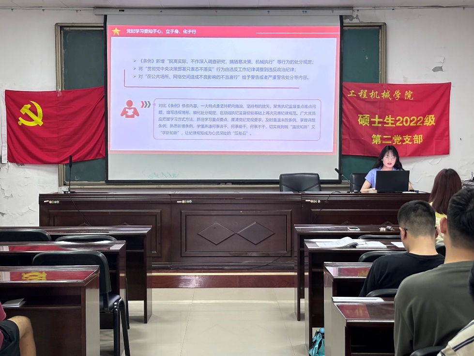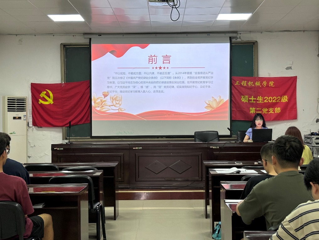 “不以规矩,不能成方圆;不以六律,不能正五音”。为落实中共中央办公厅印发的《关于在全党开展党纪学习教育的通知》要求,提升研究生党员的纪律意识, 2024年6月6日下午16时,澳门太阳城官网 硕士生2022级第二党支部在南校区学院四楼报告厅开展“学条例·守党纪”党纪学习教育。会议由支部书记赵倩主持,支部全体成员参加。