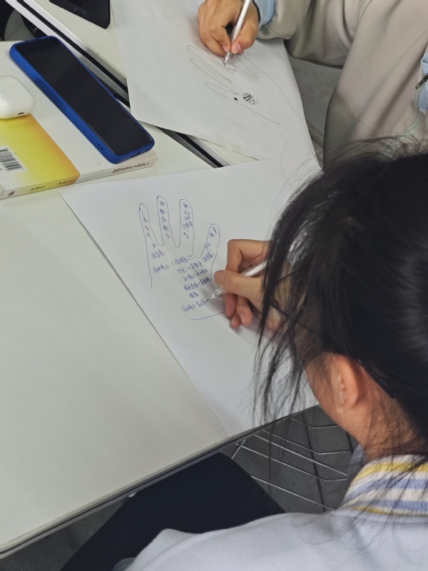 紧接着,在舒缓柔和的音乐声中,《掌心的故事》活动正式开启。同学们轻轻闭上眼睛,跟随王老师的引导,缓缓放松身体,用简单而自然的动作,释放着内心深处的复杂情绪。这一过程让同学们逐渐沉浸在自我探索之中,与内心真实的感受进行深度对话。