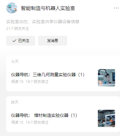 为了增强实践创新教学与科研服务水平、提升实验设备利用率、全面落实实验室仪器设备共享及有偿使用工作,实验室于2025年03月24号创建上线了“智能制造与机器人实验室”微信公众号,并在公众号平台持续发布实验室共享仪器设备的功能参数、应用场景、放置地点、预约方式等信息。共享平台在资源共享和协同创新方面迈出了重要一步,通过共享平台师生们可以更加便捷地获取所需仪器设备的信息,提升交流与合作水平,激发创新活力。