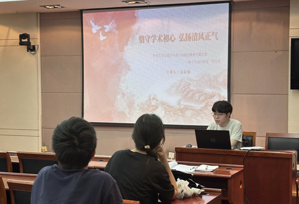 为深入贯彻中央八项规定精神学习教育,聚焦学术领域作风建设,5月23日,澳门太阳城官网 硕士生2024级第一党支部于学术交流中心第一会议室开展“恪守学术初心 弘扬清风正气”专题党课,支部全体党员参加学习,本次党课由支部书记夏俭强主讲。