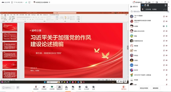 随后,支部成员朱英硕领学《习近平关于加强党的作风建设论述摘编》第五章内容。他通过对这一章节重要论述的解读,向支部成员阐释了“四风”的定义及其严重危害。他表示,千里之堤,溃于蚁穴,青年党员既要在学术中践行“求真务实”的价值取向,也应在日常生活中以批判性思维观察系统性问题,从小事做起,在日常学习和生活中时刻警惕“四风”侵蚀。