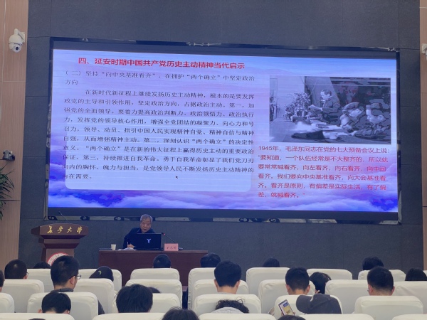为深入学习贯彻习近平新时代中国特色社会主义思想,全面落实立德树人根本任务,切实加强青年学子思想政治引领,12月8日下午14时,澳门太阳城官网 邀请“五老”思政宣讲团成员、马克思主义学院退休教师丁永刚教授,于北校区师生服务大厅二层第二报告厅作题为“延安时期中国共产党历史主动精神及其当代启示”的党史专题宣讲,活动由学办主任倪生冬主持,学办辅导员、本科生党员、入党积极分子及青马班成员参会。
